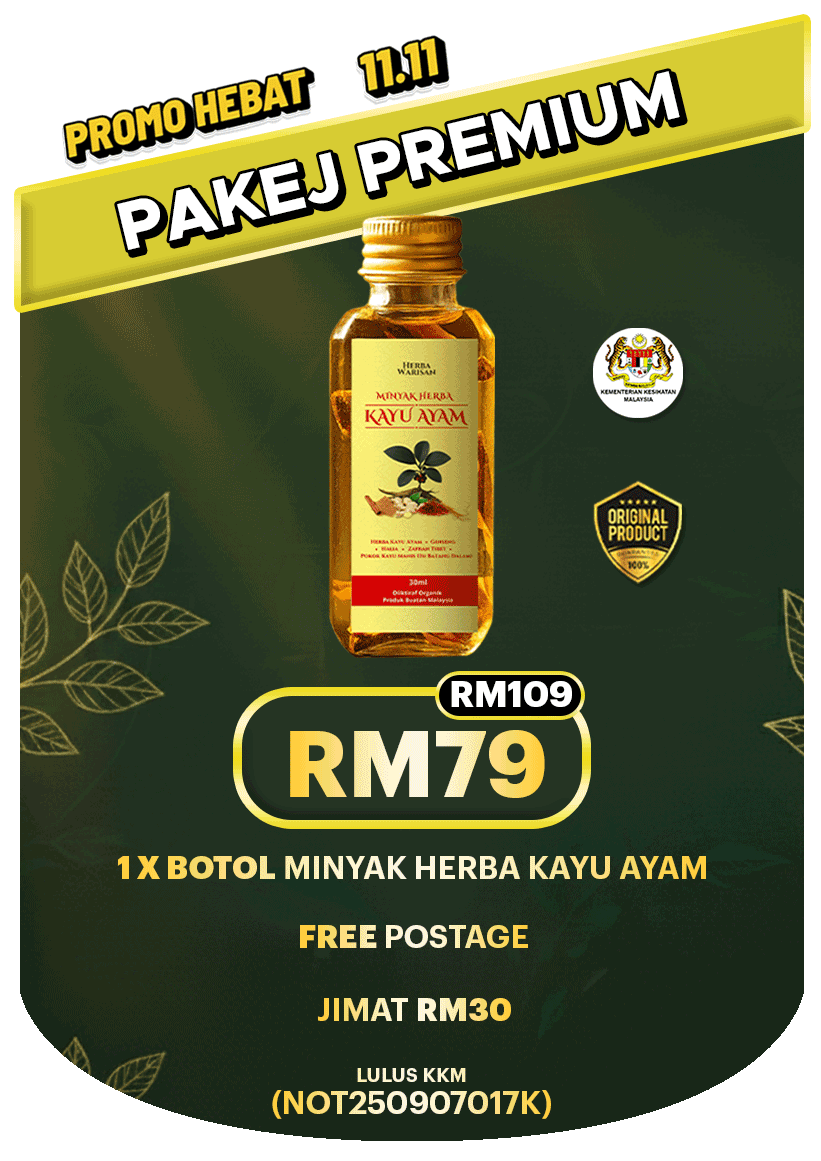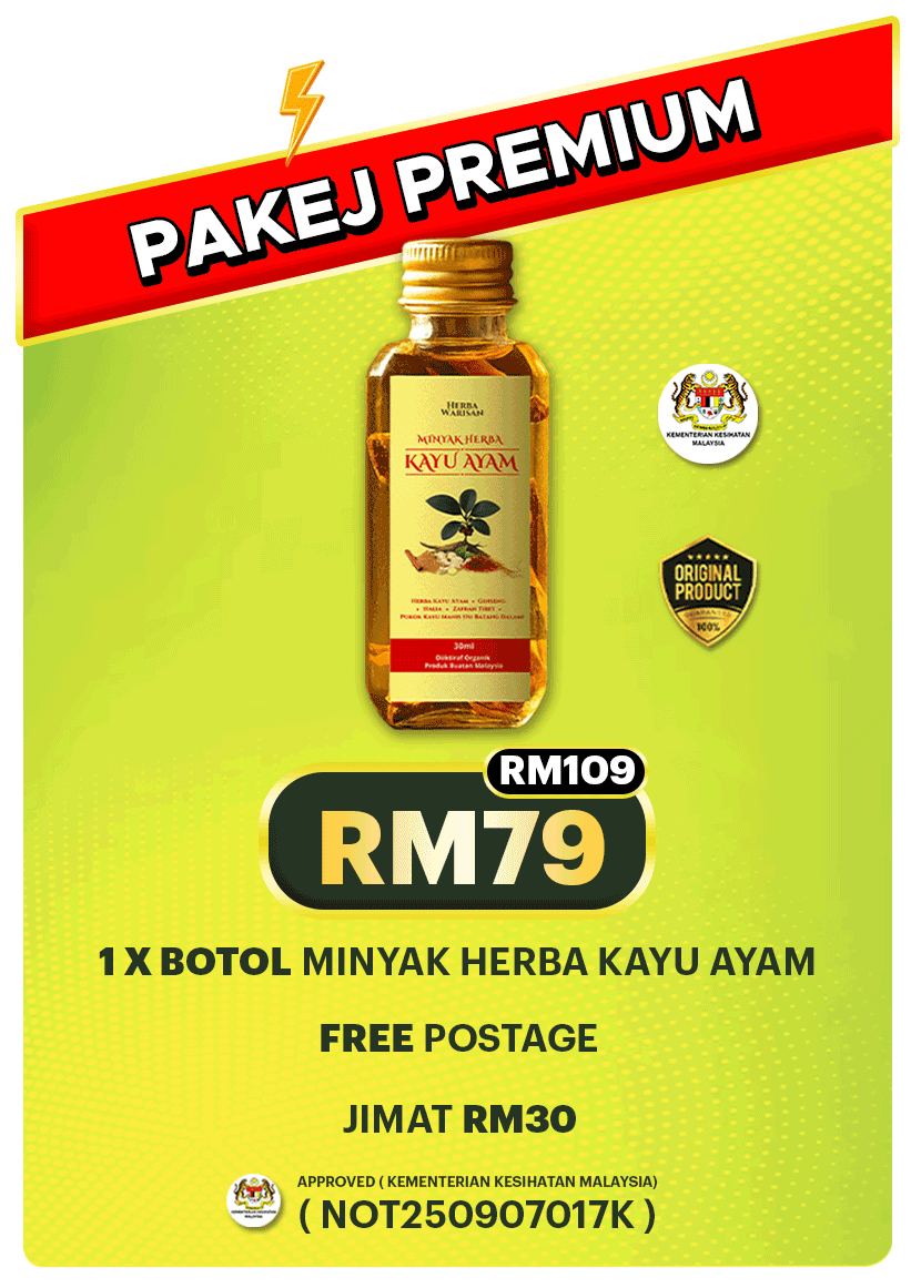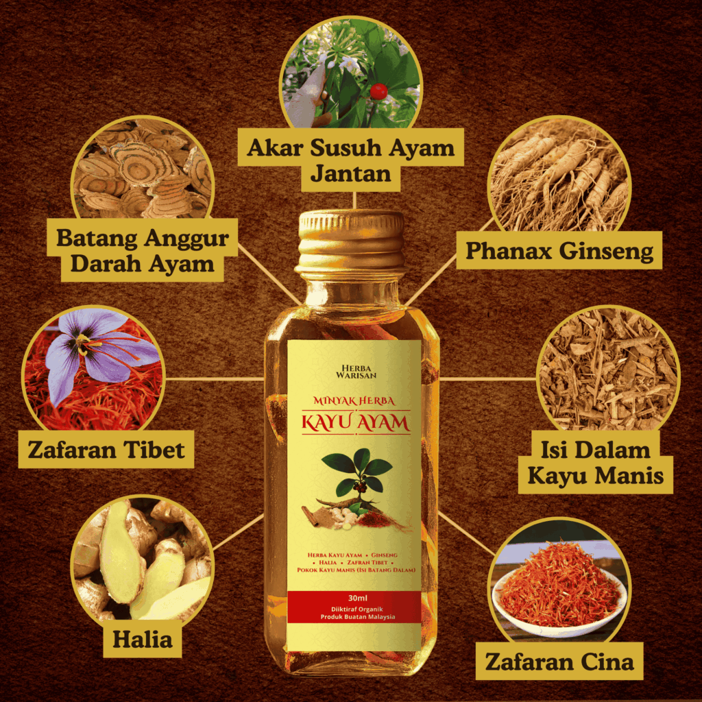Minyak Herba Kayu Ayam diformulasikan khas untuk membantu lelaki yang mengalami masalah zakar lembik, cepat lemah dan kurang bertenaga. Gabungan 7 herba premium daripada warisan Melayu dan perubatan Cina seperti Akar Susuh Ayam, Akar Batang Anggur Darah Ayam, Ginseng, Kayu Manis, Halia serta Zafaran Tibet dan Zafaran Cina berfungsi melancarkan darah, menguatkan tenaga batin dan memulihkan kejantanan secara semula jadi, selamat serta terbukti turun-temurun.